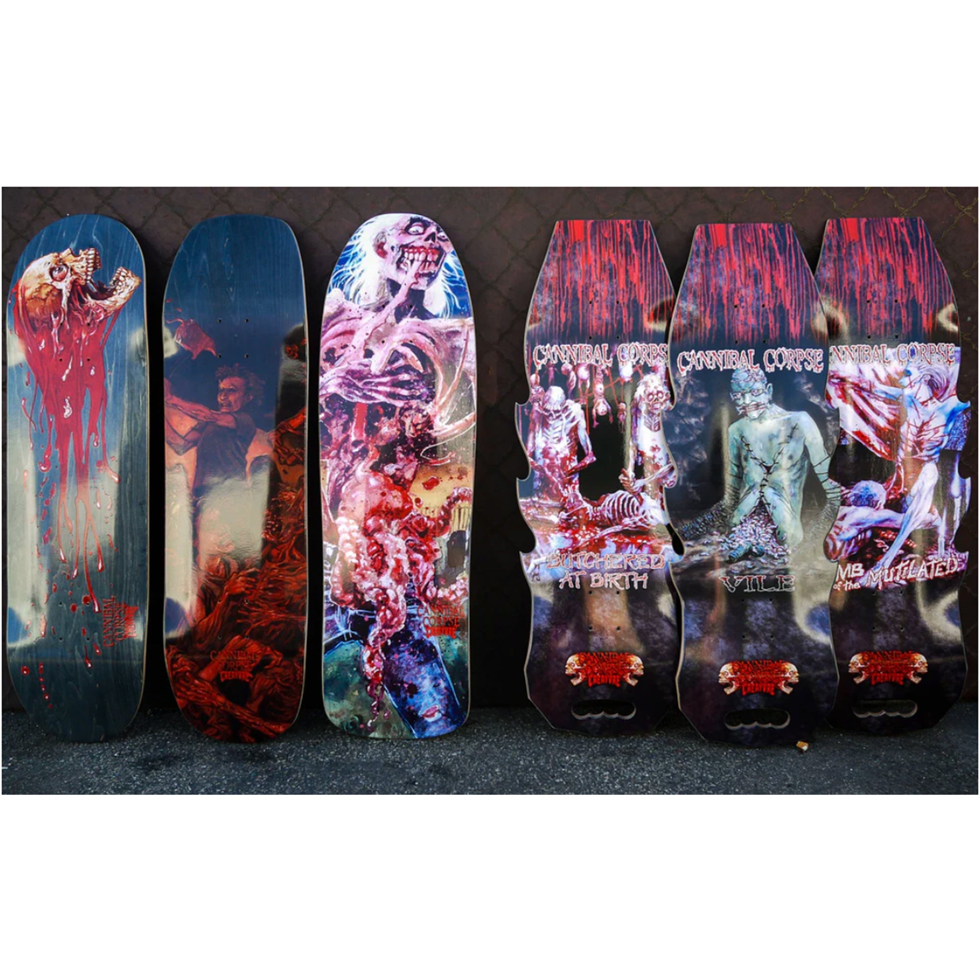 No es una gráfica más, es una de las colaboraciones más brutales en la historia de Creature Skateboards. Junto a Cannibal Corpse, una de las bandas más legendarias del death metal, la marca lleva al skate el imaginario extremo y perturbador de Vince Locke, responsable de algunas de las portadas más icónicas del grupo.